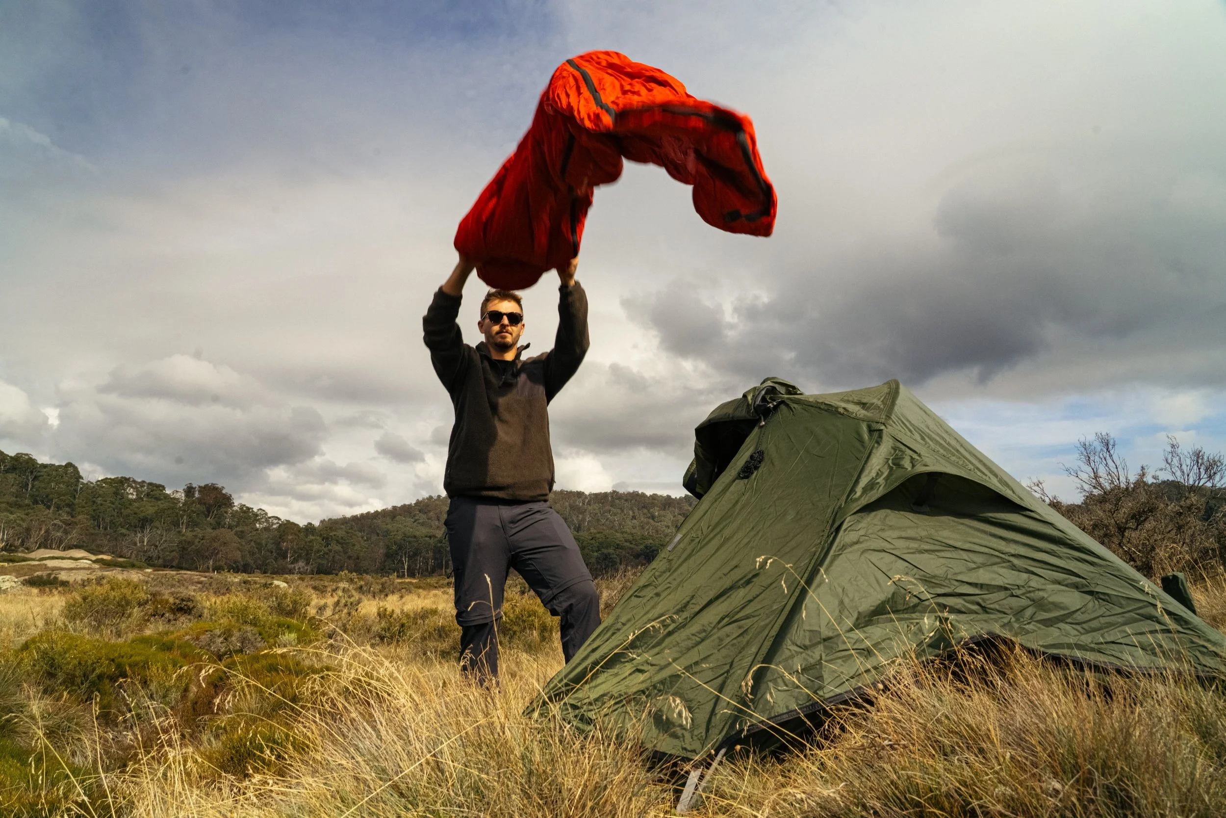 Cinematic Style: Slow, dynamic, and scenic — focused on tent setup and alpine mood
